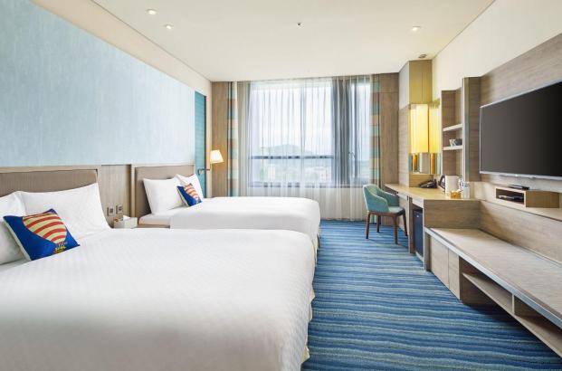-雙人加價NT$500,升等「逗陣客房一大床」房型;雙人加價NT$1,000,升等「逗陣客房兩中床」或「逗陣親子房」房型;三~四人加價NT$500,升等「逗陣客房兩中床」或「逗陣親子房」房型
